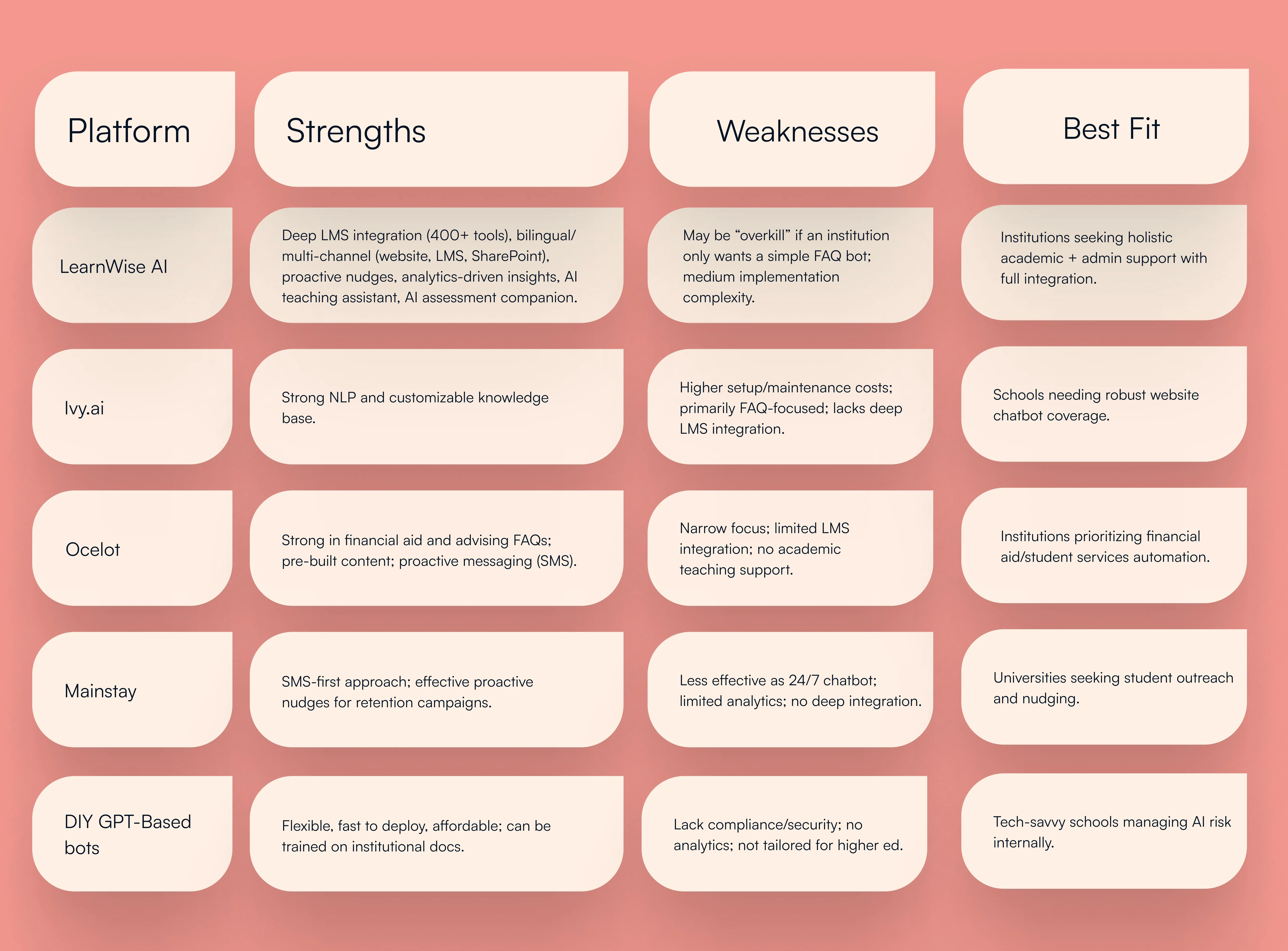 Unlike legacy chatbots (Ocelot, Mainstay) that mainly address financial aid or enrollment questions, LearnWise combines: